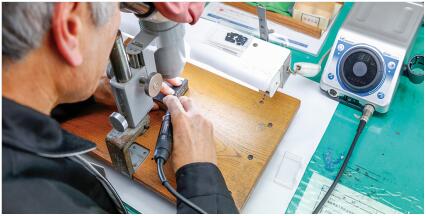 小的唱片針,最大的有45個零件組成,針尖是米粒小,肉眼看不到,因此用顯微鏡放大鏡等作業(yè)。記錄針懸臂的修理,使用的是中西NAKANISHI研磨機E-MAX系列,常用的套裝是EV410-230.