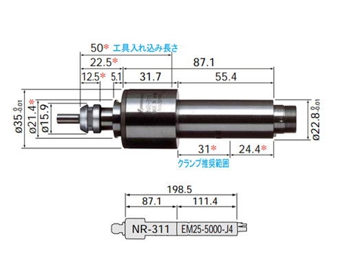 NR-311 | Φ22.8mm | 30,000 min-1 | 2μm以內(nèi) | 夾頭(CHK系列) : φ0.5~φ6.0mm | 370g |