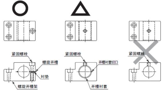 如上圖右1所示直接安裝螺絲時,會使主軸外套變形造成旋轉(zhuǎn)不良或發(fā)熱的原因。如下圖。